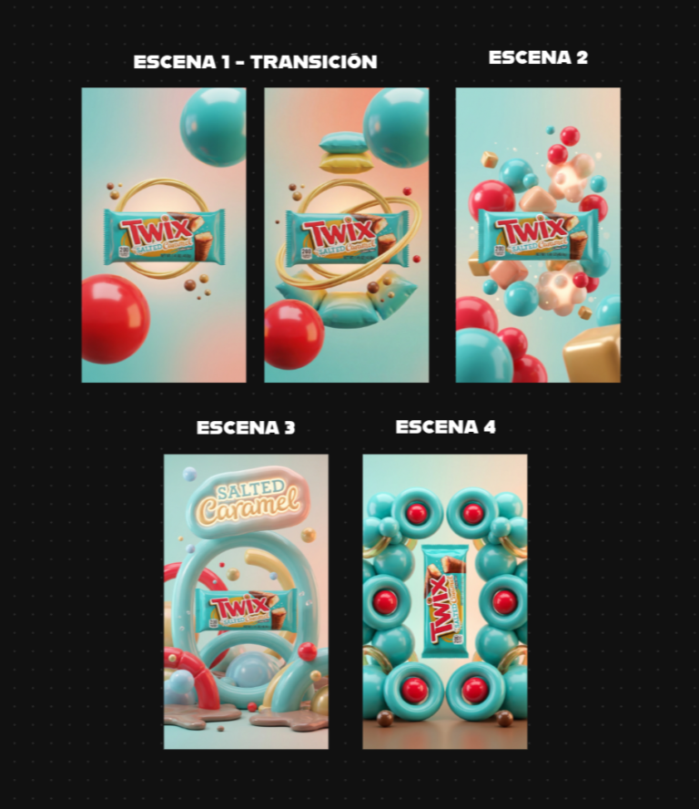 In this case, we defined a simple structure with four moments: an initial reveal (product appearance), a scene where inflatable elements begin moving around it, an expansion of the environment with more shapes, and finally a hero shot (final product shot) with the most complete composition.
