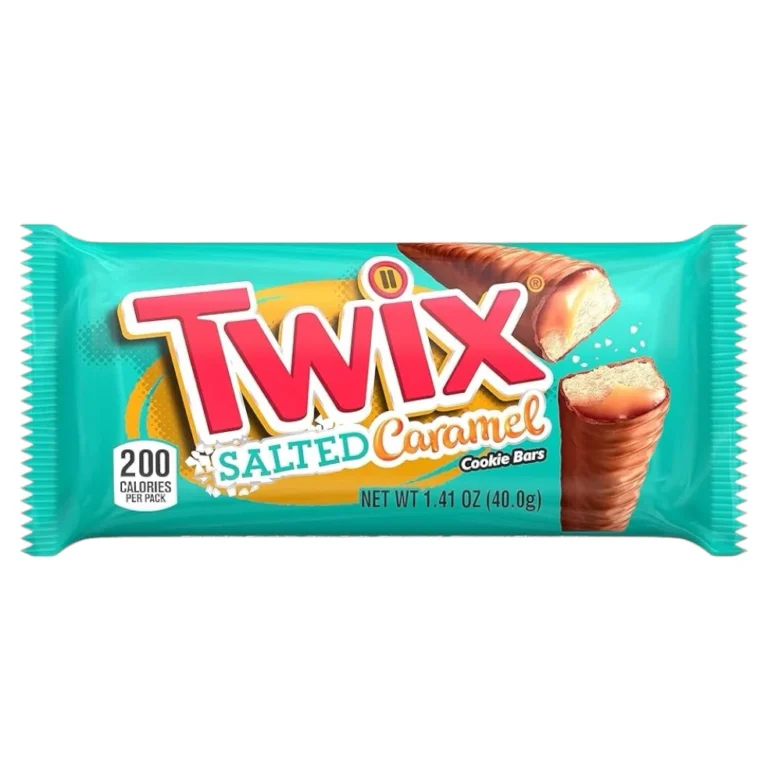 A close-up, eye-level shot features a single package of Twix Salted Caramel cookie bars as the main subject, positioned centrally. The packaging is a vibrant teal with the iconic Twix logo in red and yellow, and an image of the cookie bar with visible caramel and cookie layers. Surrounding the product are several large, glossy, spherical balloons in teal and red, creating a festive and playful atmosphere. The background is a soft, gradient blend of teal and orange, with subtle lighting that highlights the textures of the balloons and the product.