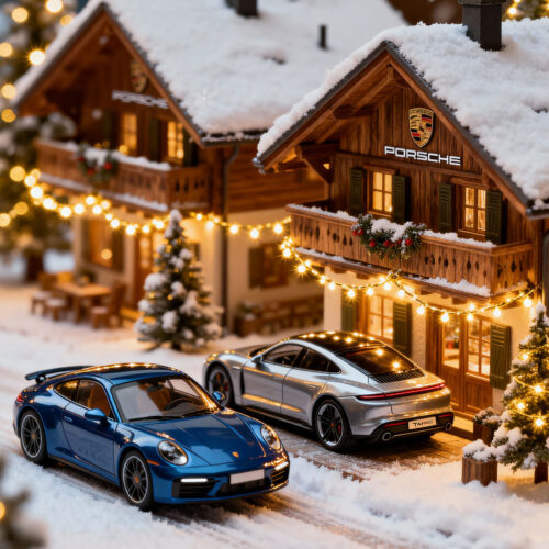 A miniature winter village scene features two Porsche cars, one blue and one silver, parked on a snow-covered road in front of two wooden chalets. The chalets are adorned with Christmas lights and snow on their roofs, with smoke gently rising from their chimneys. Decorated Christmas trees with warm lights are scattered around the scene, and snowflakes are falling. The overall atmosphere is festive and cozy, with a shallow depth of field that blurs the background and foreground elements, emphasizing the cars and chalets.
