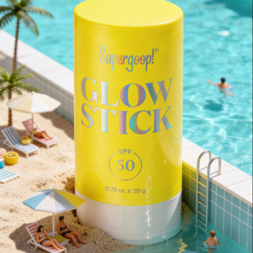 A bright yellow Supergoop! Glow Stick SPF 50 is the central focus, standing on a miniature sandy beach next to a bright blue swimming pool. The product packaging features holographic lettering. Tiny palm trees dot the sand, and miniature figures lounge on beach chairs under small umbrellas. Other tiny figures swim in the pool, with one person near the ladder. The water is clear and reflects the sunlight, creating ripples. The overall scene is a playful, miniature diorama evoking a summer vacation vibe.