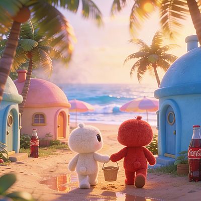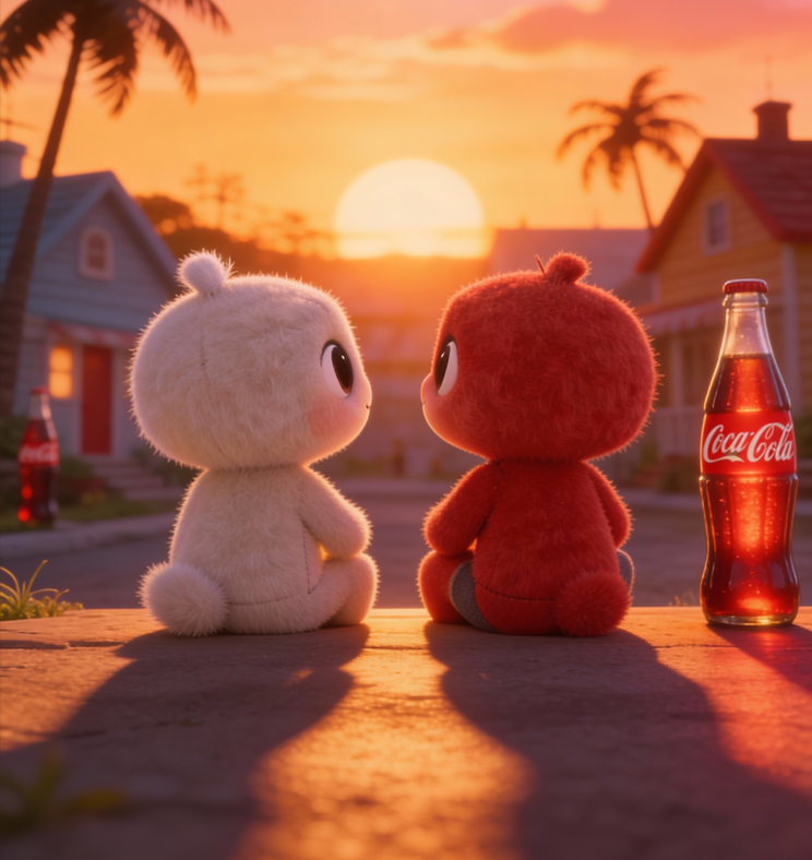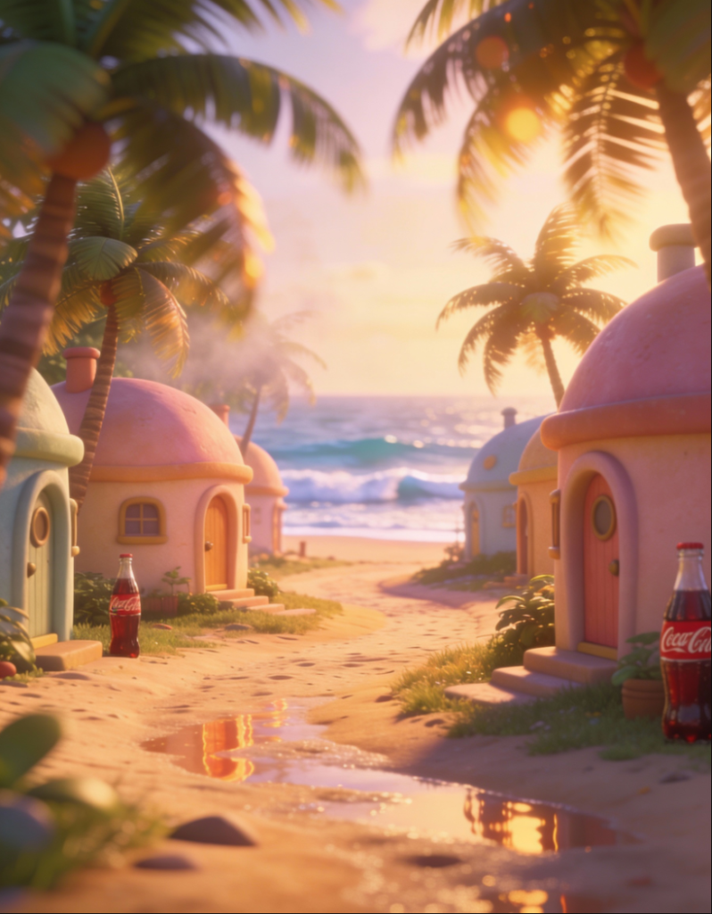 Pixar-style 3D animated miniature Coca-Cola summer village during golden hour, long shadows, warm orange and pink tones, characters watching the sunset together, bottles subtly glowing in the warm light, palm trees silhouetted, emotional and nostalgic family-film feeling, ultra-polished cinematic rendering
