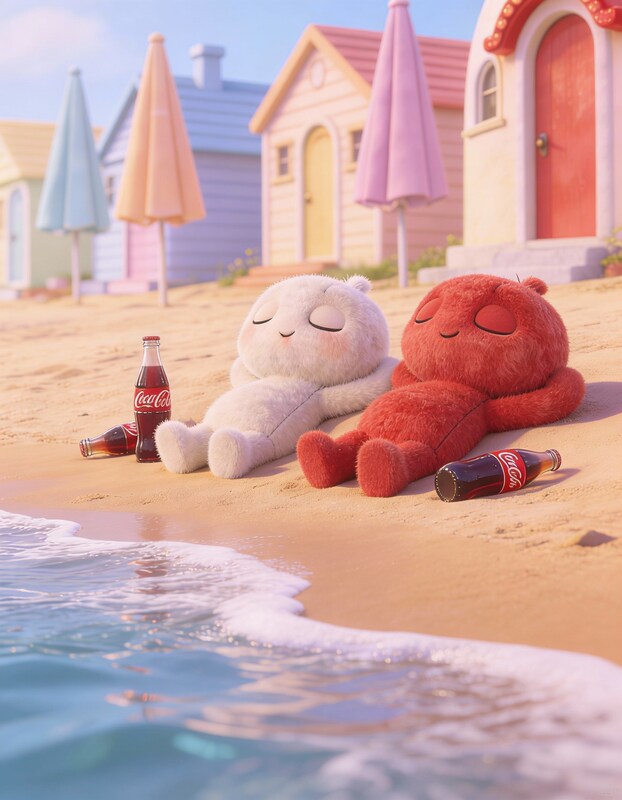 Pixar-style 3D animated miniature summer village in the afternoon, characters relaxed on the sand near the shore, empty bottles of Coca Cola resting beside them, gentle waves approaching, pastel houses and umbrellas behind, softer light, calm and content atmosphere, cinematic depth of field, high-end animation quality