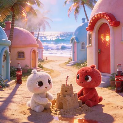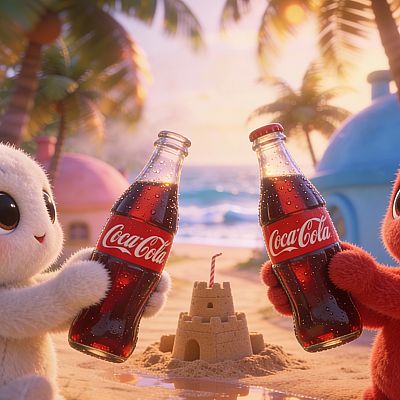 Pixar-style 3D animated miniature beach scene, the two plush characters holding classic glass Coca-Cola bottles, condensation droplets visible, soft reflections of sunlight on the glass, sandcastle centered between them, warm coastal light, shallow depth of field, refreshing and emotionally satisfying moment, premium cinematic render, cute and iconic