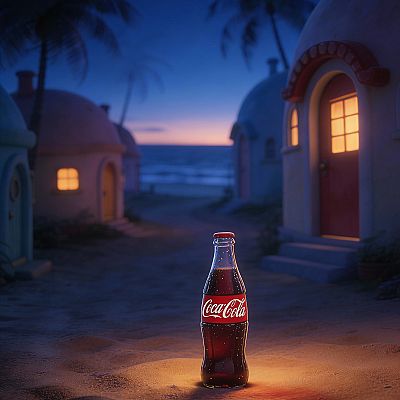 Cinematic film still, Pixar-style 3D animated miniature Coca-Cola summer village in a wide establishing shot, set during blue hour just after sunset. The sky is deep indigo with a faint warm glow lingering on the horizon. Pastel rounded beach houses softly lit from within, warm window lights creating a cinematic contrast against the cool evening tones. Palm trees appear as gentle silhouettes, slightly blurred by depth of field. The ocean is calm, reflecting minimal light, almost still.