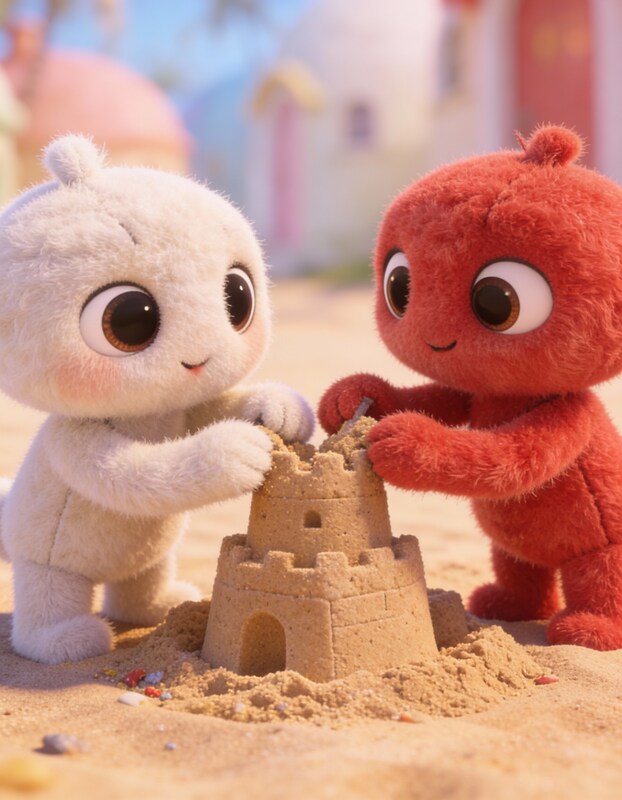 Pixar-style 3D animated miniature beach close-up, the two plush characters building a small sandcastle together, rounded shapes, soft plush textures, tiny details in the sand, pastel village softly blurred in the background, bright summer light, playful and heartwarming family-movie atmosphere, cinematic depth of field