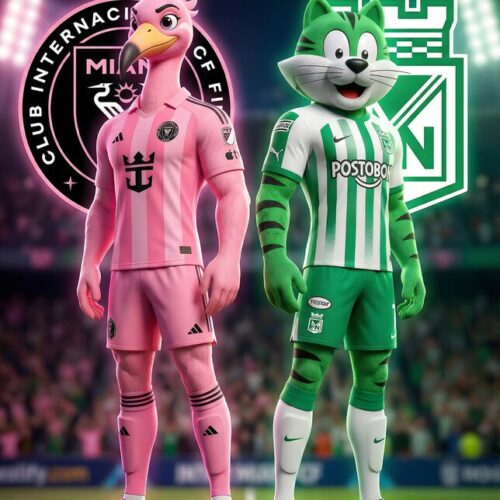 Stylized anthropomorphic mascots in cinematic 3D cartoon style, pink heron mascot of Inter Miami CF and green tiger mascot of Atlético Nacional of @img2 , standing back to back in the exact same heroic pose as Lionel Messi and Edwin Cardona, humanoid posture, muscular arms and legs, expressive eyes, confident stance, smooth stylized feathers and fur, vibrant colors, dramatic stadium background, green and pink cinematic rim lighting, ultra clean Pixar-quality render, epic sports mythology vibe, vertical 9:16
