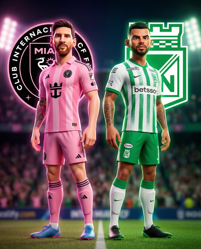 Stylized 3D cartoon sports render, cinematic animated style, inspired by anime sports energy and modern animation films, full body characters visible head to toe, Lionel Messi inspired character wearing the pink Inter Miami CF kit @img1 , standing back to back with Edwin Cardona of @img3 inspired character wearing the green Atlético Nacional kit @img2 , slightly exaggerated proportions with strong athletic torso, long visible legs and feet fully in frame, expressive confident faces, heroic poster pose, natural standing stance, clean smooth textures, vibrant colors, Inter Miami CF logo behind Messi, Atlético Nacional logo behind Cardona, dramatic stadium lighting, green and pink rim light outlining the entire bodies, shallow depth of field, ultra polished high-end 3D cartoon render, professional sports poster quality, vertical 9:16