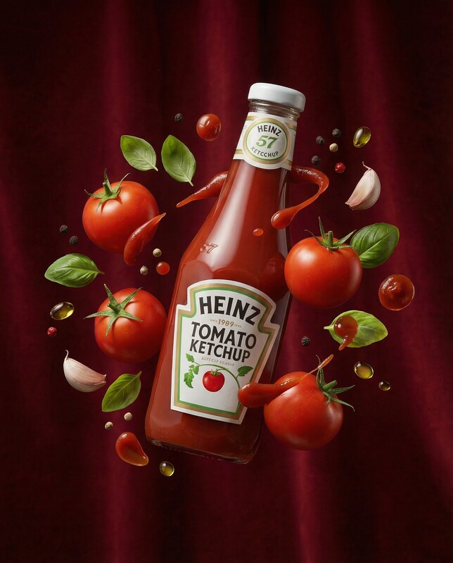 A bottle of Heinz Tomato Ketchup is centrally placed on a dark red, draped fabric background. The bottle is tilted, with ketchup splashing out and forming dynamic shapes. Surrounding the bottle are several fresh tomatoes, basil leaves, garlic cloves, peppercorns, and droplets of oil, all arranged in a scattered, artistic manner. The lighting is dramatic, highlighting the textures and colors of the ingredients and the ketchup.
