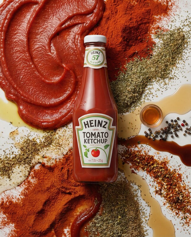 A top-down shot features a bottle of Heinz Tomato Ketchup placed centrally on a white surface. The bottle is surrounded by various ingredients, including a large swirl of ketchup on the left, piles of paprika and dried herbs, and drizzles of sauces and oils. There's also a small dish of honey and a scattering of peppercorns. The lighting is bright, highlighting the textures and colors of the ingredients.