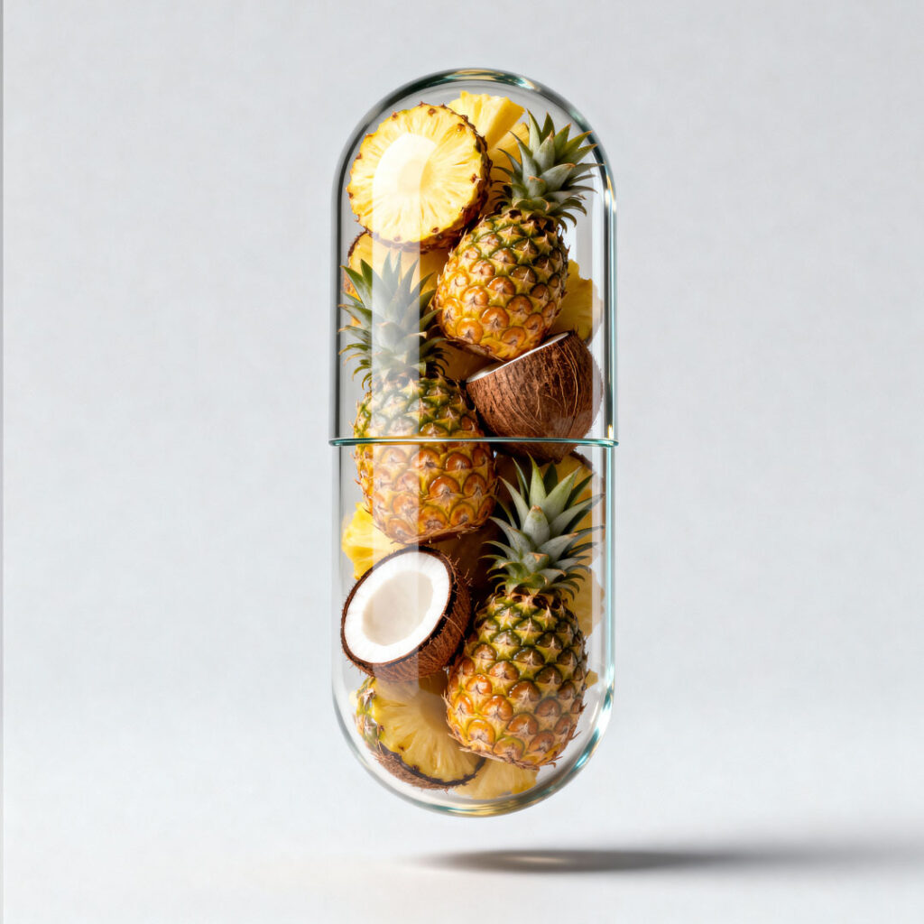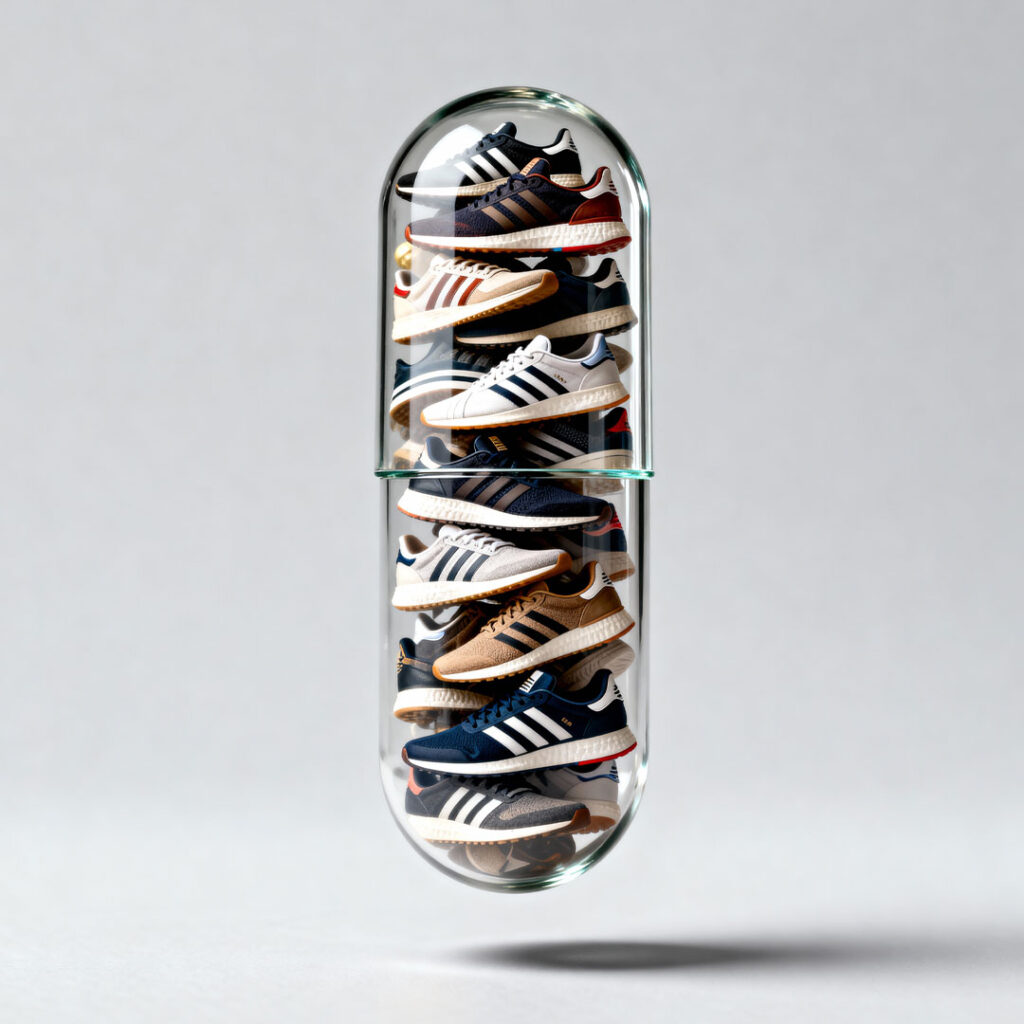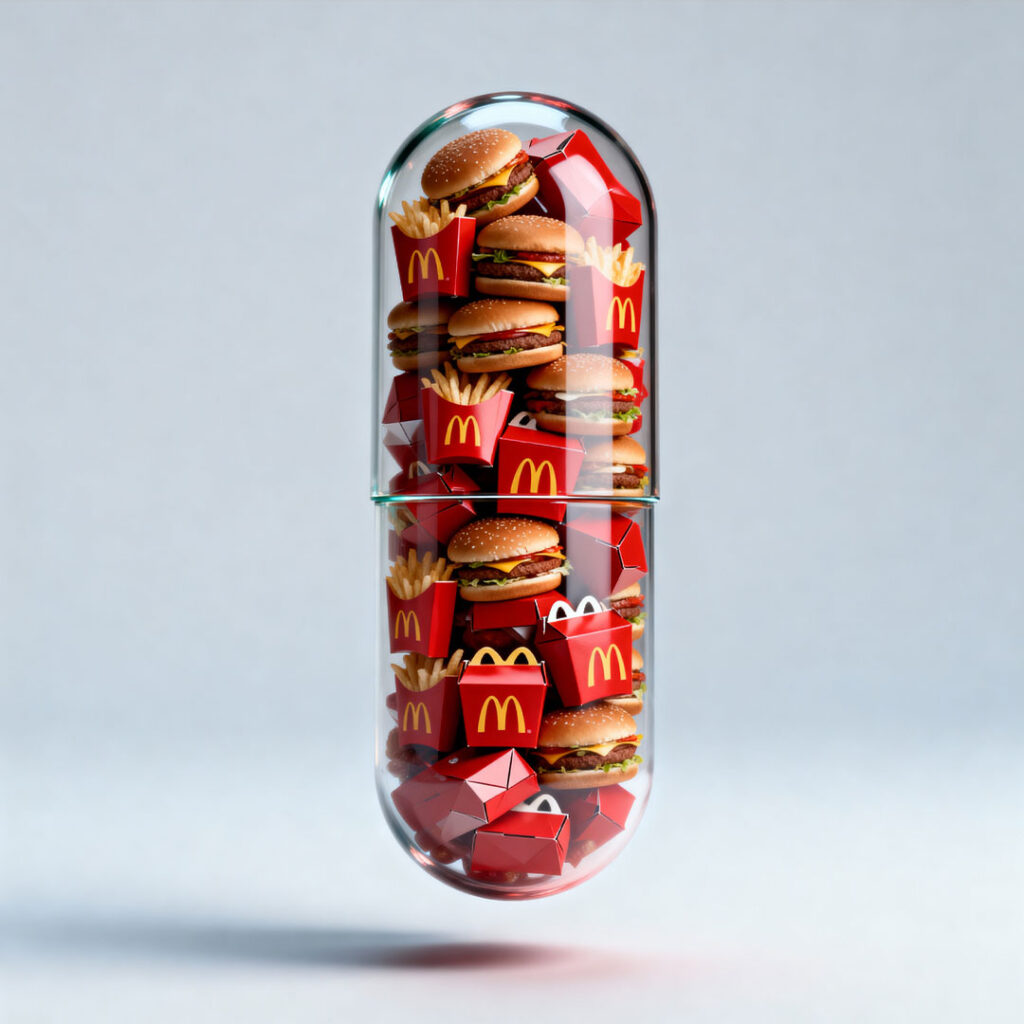 A clear, capsule-shaped container is filled with McDonald's hamburgers and french fries. The capsule is divided into two sections by a thin glass line. The top section contains several hamburgers stacked vertically, each with a side of french fries. The bottom section is packed with smaller McDonald's boxes, some open to reveal hamburgers and fries, and others closed. The overall composition is clean and minimalist, with a light gray background that emphasizes the vibrant red and yellow of the McDonald's packaging and the golden brown of the food. The lighting is soft and diffused, creating subtle shadows that give the capsule a sense of depth and volume.