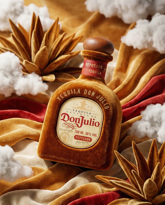 A bottle of Don Julio Reposado tequila, covered in brown velvet, is centrally placed on a bed of draped velvet fabric in shades of gold, red, and cream. The bottle has a leather cap and a label with the brand's name and details. Fluffy white cotton balls are scattered around the bottle, resembling clouds. On either side of the bottle, stylized agave plants made of gold velvet add to the luxurious and festive atmosphere. The lighting is soft and warm, highlighting the textures and rich colors of the scene.