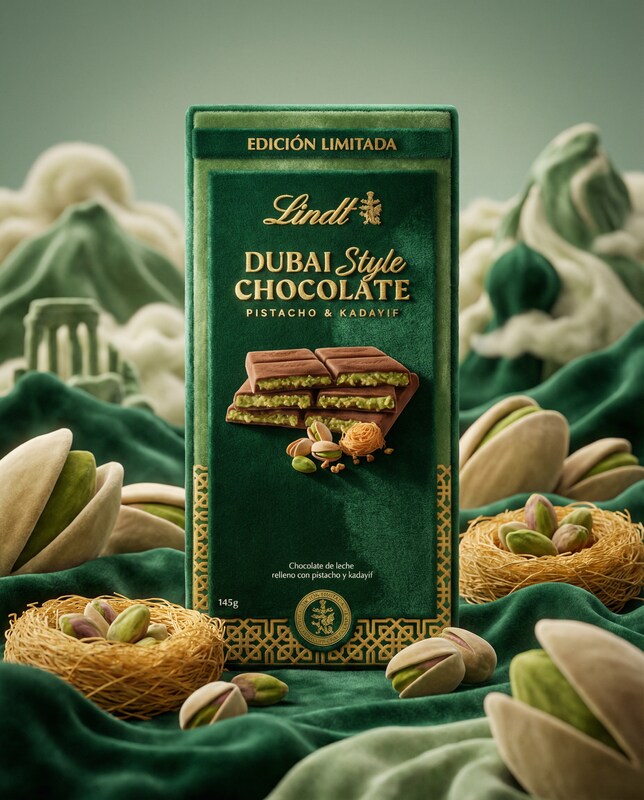 A close-up, eye-level shot features a Lindt Dubai Style Chocolate bar, prominently displayed in the center. The chocolate bar is a limited edition, with "EDICIÓN LIMITADA" printed at the top. The packaging is a rich emerald green, with gold lettering and intricate patterns. The chocolate itself is depicted as milk chocolate filled with pistachio and kadayif, with a visual representation of the chocolate bar broken into pieces, showcasing the filling.