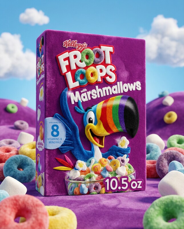 A close-up, eye-level shot showcases a Kellogg's Froot Loops with Marshmallows cereal box, angled slightly to the right. The purple box features the iconic Froot Loops logo in vibrant, puffy letters, with Toucan Sam, the brand's mascot, depicted in a cheerful pose. He's holding a marshmallow and a spoonful of colorful cereal, which spills out of a clear bowl at the base of the box. The background is a whimsical landscape of rolling purple hills dotted with Froot Loops and marshmallows, under a bright blue sky with fluffy white clouds. The lighting is soft and inviting, highlighting the textures of the cereal box and the surrounding elements.