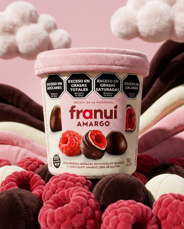 A close-up, eye-level shot features a pink-lidded tub of "Franui Amargo" ice cream, surrounded by a generous scattering of fresh raspberries and chocolate-covered raspberries. The tub is adorned with black hexagonal warning labels indicating excess sugar, total fats, saturated fats, and calories. The background is a soft, blurred pink, with fluffy, cloud-like shapes and draped fabric in shades of pink, brown, and cream adding a whimsical touch. The lighting is soft and diffused, highlighting the textures of the fruit and chocolates.