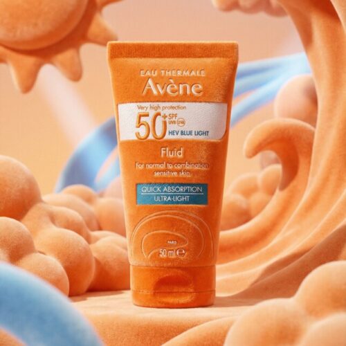 A product shot of an orange tube of Avène sunscreen with SPF 50 is centered in the frame. The background is a whimsical, soft-focus landscape of orange, cloud-like forms and blue wavy lines, evoking a sense of warmth and protection. The lighting is soft and diffused, creating a gentle glow on the product and its surroundings. The overall aesthetic is playful and inviting, suggesting a gentle and effective sun protection experience.