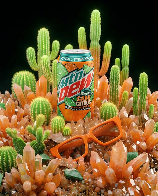 A can of Mtn Dew Baja Cabo Citrus is placed in the center of a collection of small cacti and large orange crystals. In front of the can and crystals, a pair of orange-rimmed glasses is laid down. The background is black.