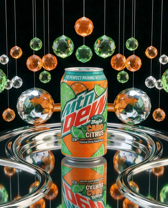 A Mountain Dew Baja Cabo Citrus can is centered in the frame, reflected on a polished silver tray. The can is surrounded by numerous hanging, faceted crystal orbs in shades of orange, green, and clear, creating a festive and luxurious atmosphere. The background is a solid black, emphasizing the vibrant colors of the can and the reflective quality of the orbs and tray.