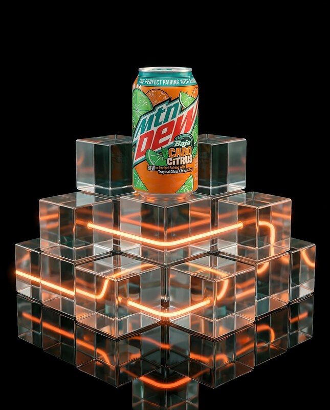 A Mtn Dew Baja Cabo Citrus can is centered on a tiered display of clear glass cubes. The cubes are arranged in a pyramid shape, with each layer having fewer cubes than the one below. Orange neon lights are embedded within the cubes, creating a glowing effect. The background is black, and the cubes are reflected on a glossy black surface below.