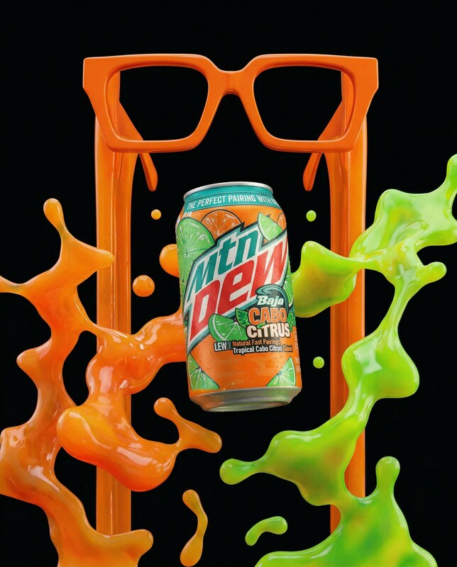 A can of Mountain Dew Baja Cabo Citrus is centered in the frame, surrounded by abstract, liquid-like splashes of orange and lime green. An orange, stylized pair of glasses is positioned behind the can, with its arms extending downwards and outwards. The background is a solid black.