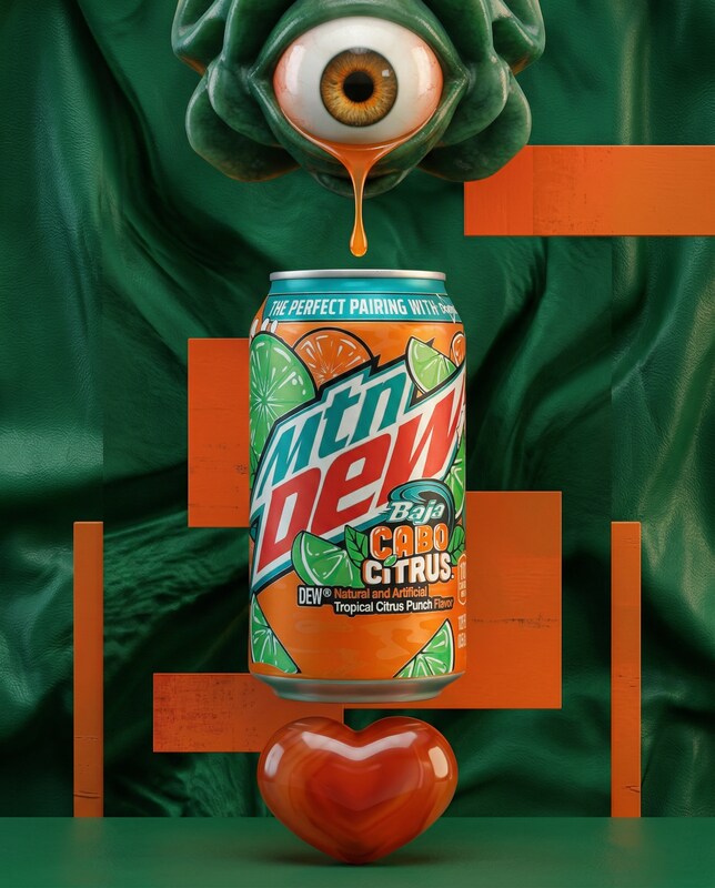 A surreal still life features a can of Mtn Dew Baja Cabo Citrus at the center, suspended in mid-air. Above it, a grotesque green creature with a single, large, realistic eye drips orange liquid onto the can. The background is a textured, dark green fabric, with two orange rectangular blocks placed vertically on either side of the can. Below the can, a glossy, orange heart shape rests on a green surface. The lighting is dramatic, highlighting the textures and glossy surfaces.