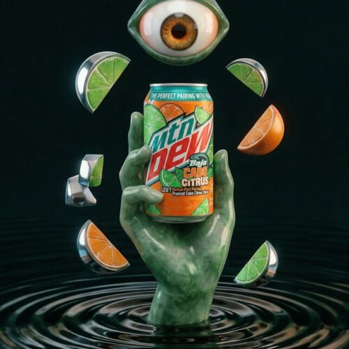 A surreal still life features a green, jade-like hand emerging from rippling dark water, holding a can of Mtn Dew Baja Cabo Citrus. The can is surrounded by floating elements: a realistic human eye with a brown iris, slices of lime and orange, and metallic, geometric shapes. The background is a dark, moody gradient.