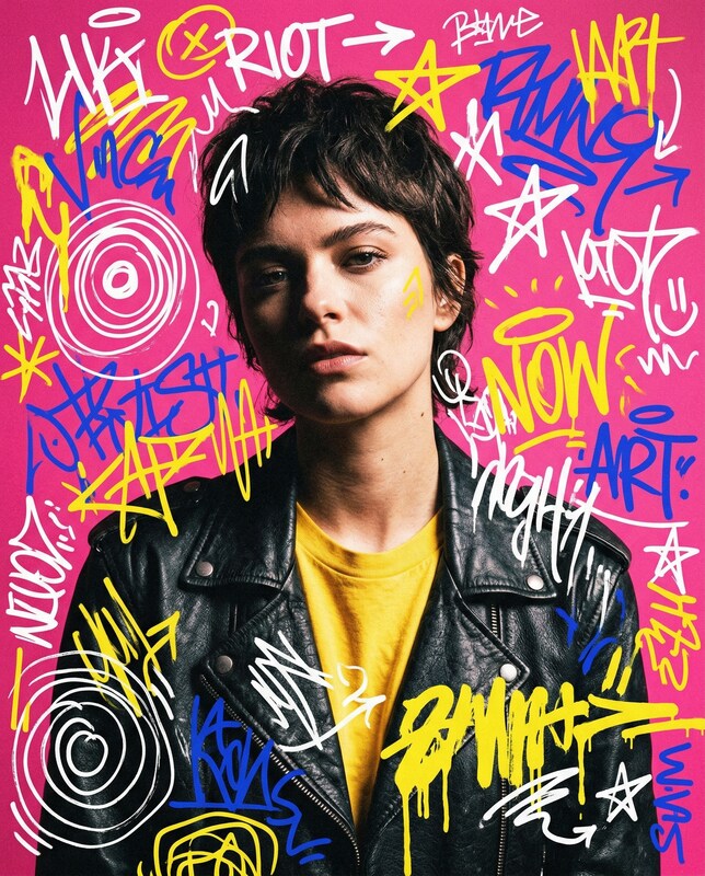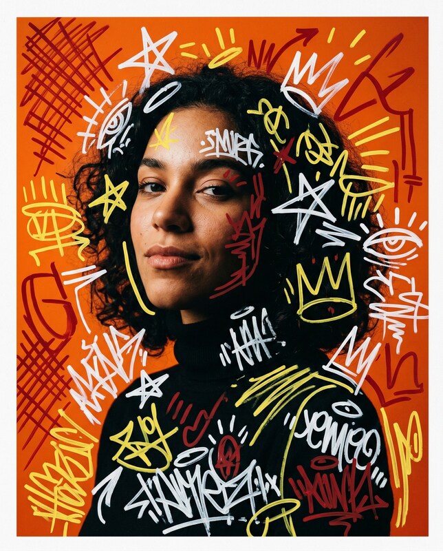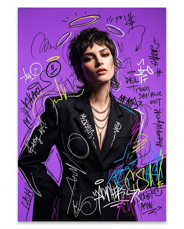 fashion editorial portrait photography, vibrant purple background, dramatic studio lighting, realistic portrait, dense graffiti style doodles drawn over the photograph using paint markers and ink, chaotic sketch lines, circles, halos, abstract symbols, thick and thin marker strokes, multicolor doodle overlay, experimental contemporary poster design