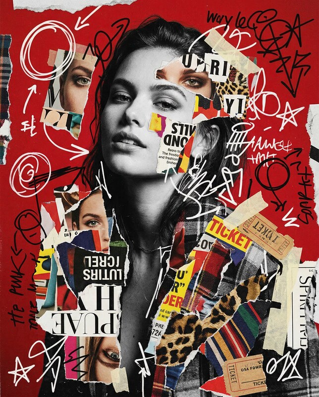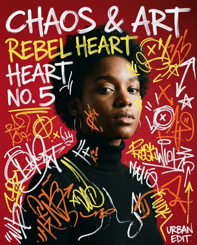 real studio portrait photography, vibrant solid red background, high contrast editorial lighting, dense mixed media collage pasted over the photograph using many torn magazine cut-outs, patterned fabrics and textured papers, overlapping collage layers covering parts of the face, chaotic hand drawn white marker doodles and graffiti symbols drawn across the image, circles, scribbles, abstract marks, energetic mixed media poster style
