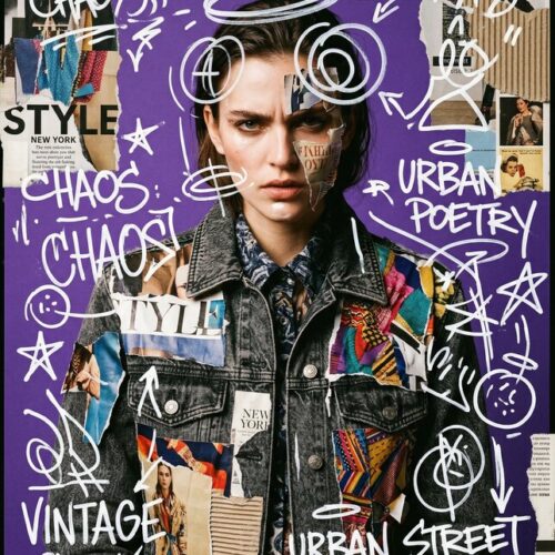 fashion editorial portrait photograph with bold purple background, realistic studio lighting, heavy mixed media collage pasted onto the photograph using numerous magazine fragments, textile patterns and paper textures, layered collage elements covering the portrait, dense hand drawn graffiti doodles drawn with white paint marker across the image, circles, halos, abstract symbols and sketch lines, chaotic mixed media poster aesthetic