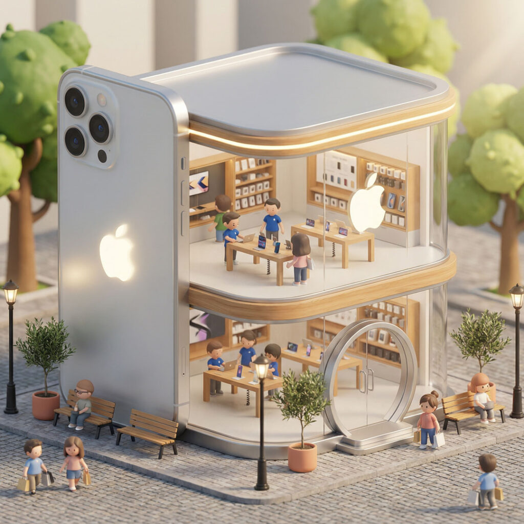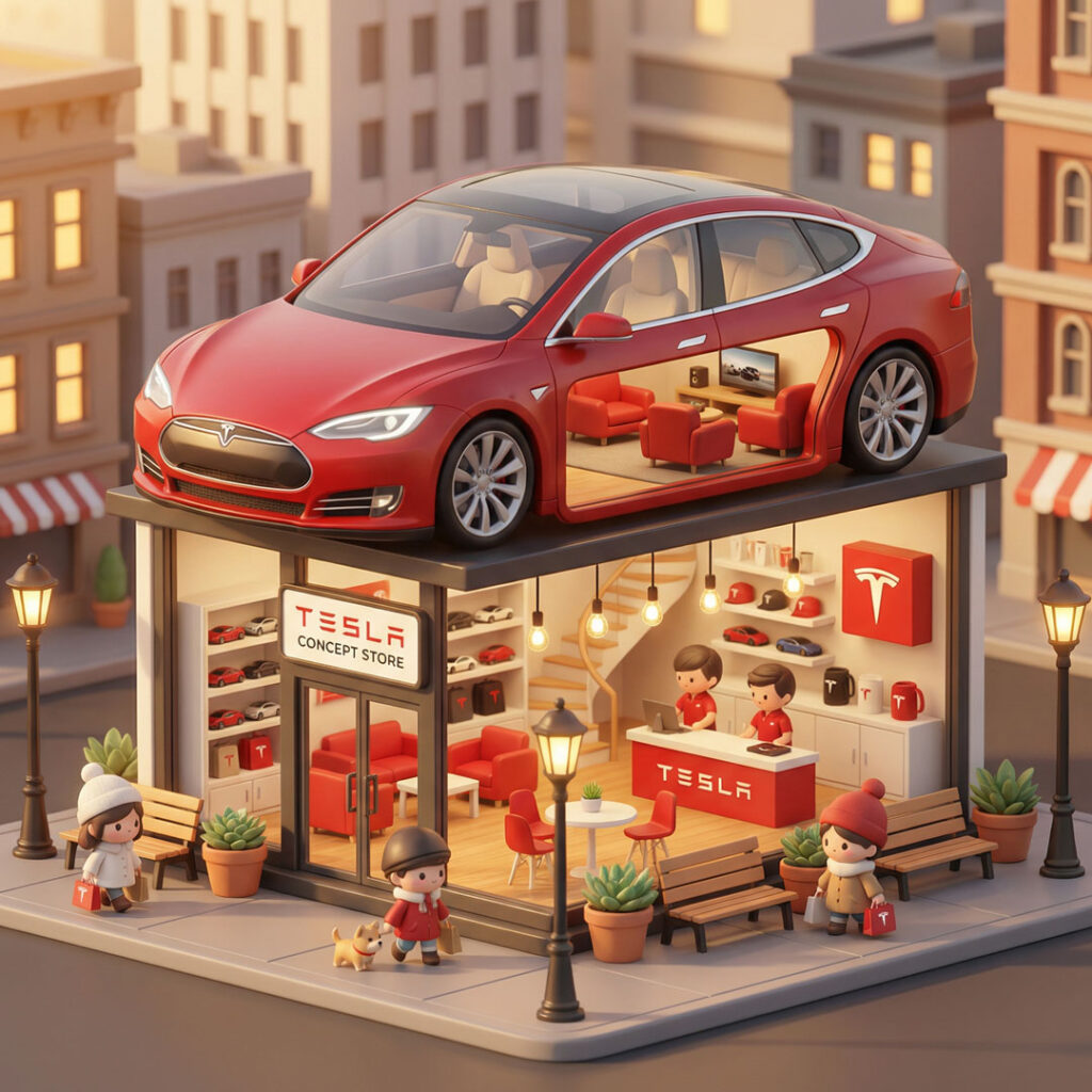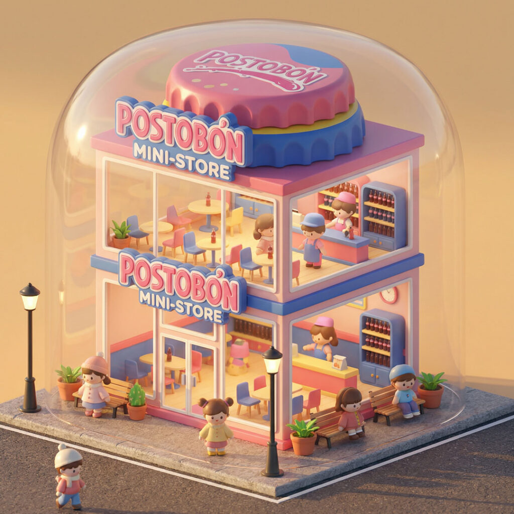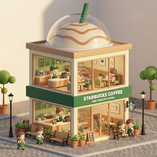 A miniature, two-story Starbucks coffee shop concept store is depicted in a charming, isometric view. The building features large glass windows, revealing detailed interiors of both floors. The ground floor has a counter with a barista, display cases, seating areas, and customers. The second floor also shows a counter, seating, and customers. The exterior is adorned with Starbucks branding, potted plants, benches, and streetlights, all set on a cobblestone street. The roof is topped with a large, stylized dome resembling a caramel frappuccino with a green straw. The overall aesthetic is cute and stylized, with soft lighting and a warm color palette.